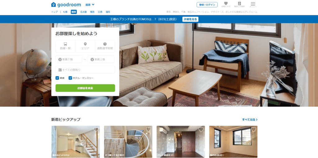 リノベーション賃貸の大手「goodroom」は、一都三県に加えて、札幌、名古屋、関西、広島、福岡など、対象エリアが多く、各物件の良いところも、気になるところも正直に掲載しているのが特徴です。
