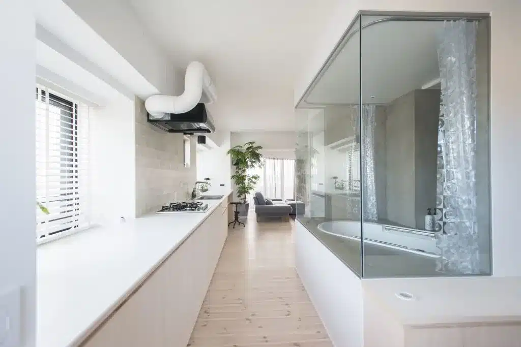 部屋の真ん中にガラス張りのお風呂が現れる他にはないデザインの事例です。ガラス越しに窓からの眺望を楽しむことが出来ます。
