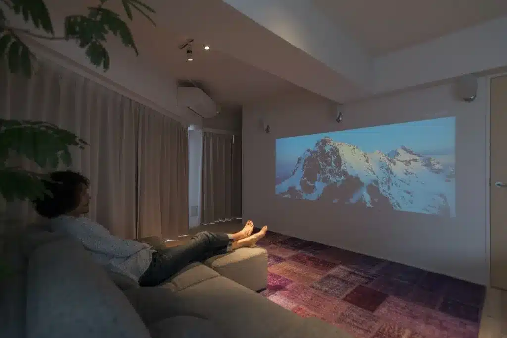 常識にとらわれないことで、シアタールームと明るく眺めのよいバスルームを実現。フロアには全面タイルが張られ、まるでホテルのような雰囲気です。