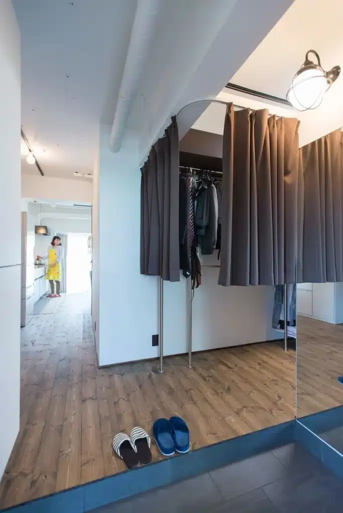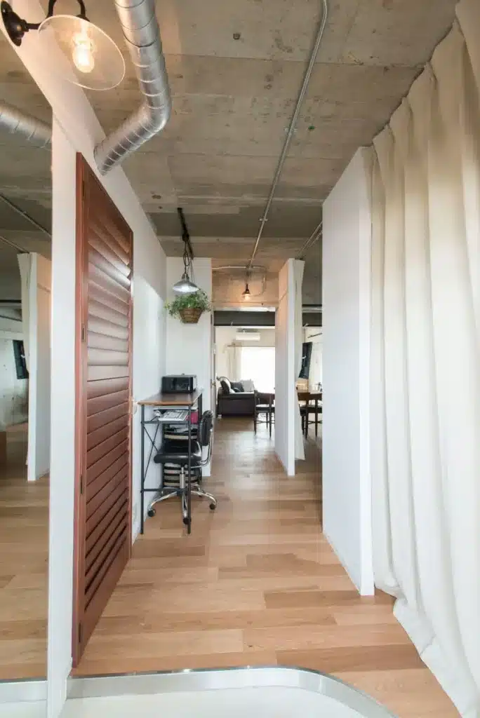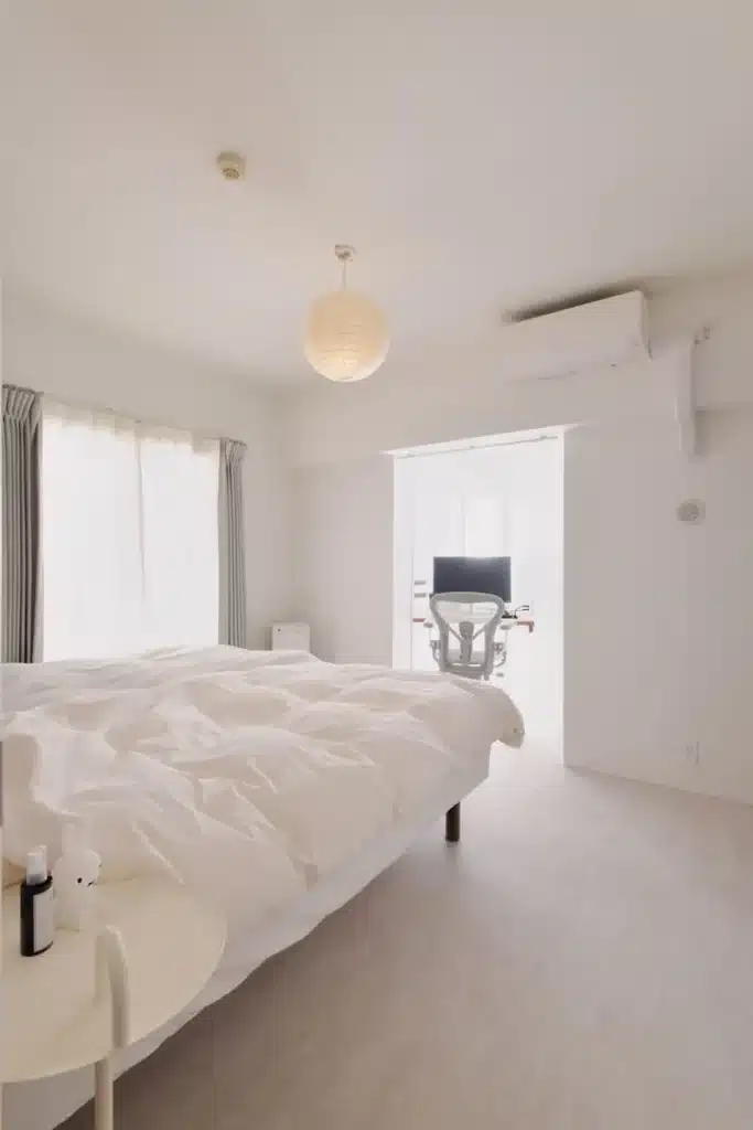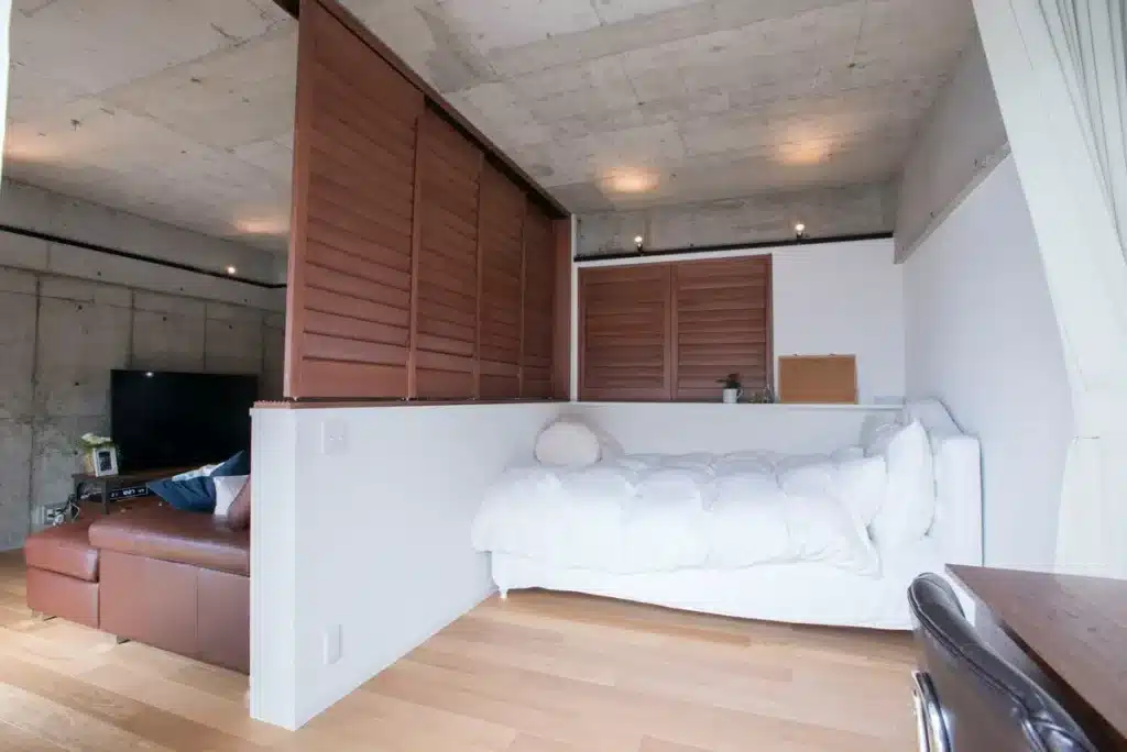 3LDKのお部屋の壁をすべて取り払い、大空間ワンルームへと変更した事例です。プライベートが気になる寝室は壁ではなくカーテンやパーテーションなどで間仕切りを。