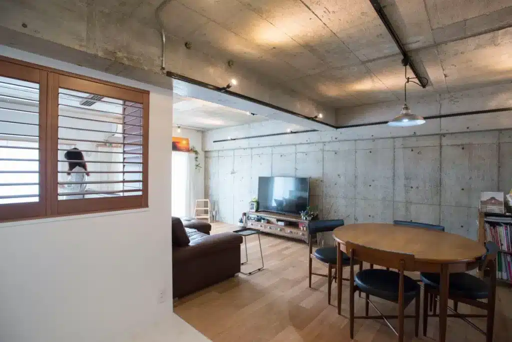コンクリート躯体の表情を活かしたリノベ空間/ハイスペックな住設機器/光や風、視線を緩やかに調整するプランテーションシャッター
