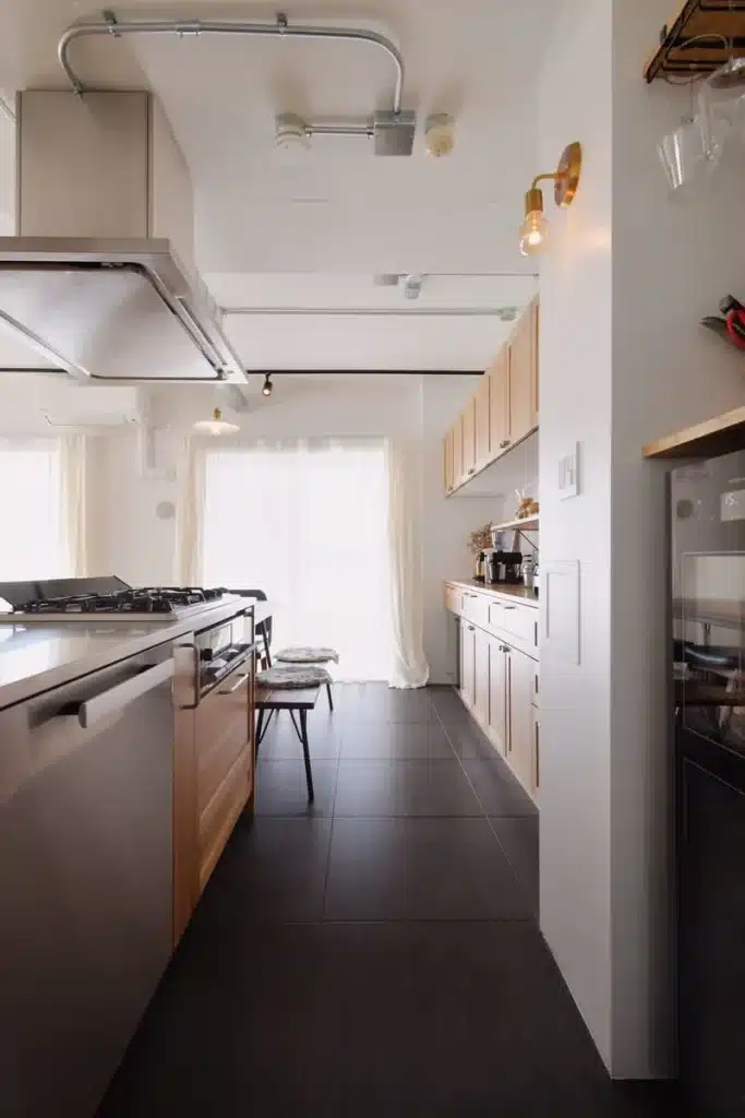 キッチンを壁付けにし、細長くとることで佐合スペースを確保しつつも室内を圧迫せず開放感のある仕上がりに。