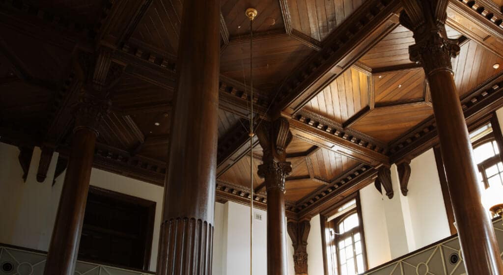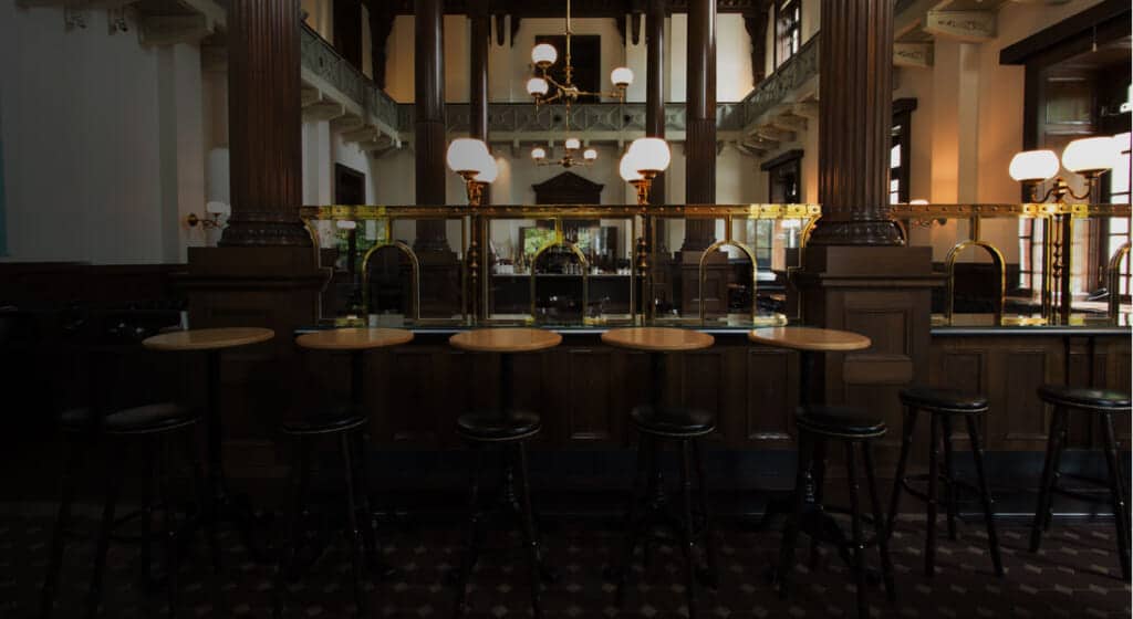 木の梁や装飾、ガス灯風照明など歴史的要素を活かし、銀行営業室の空気感を残しながらカフェとして現代的に再利用しています。
