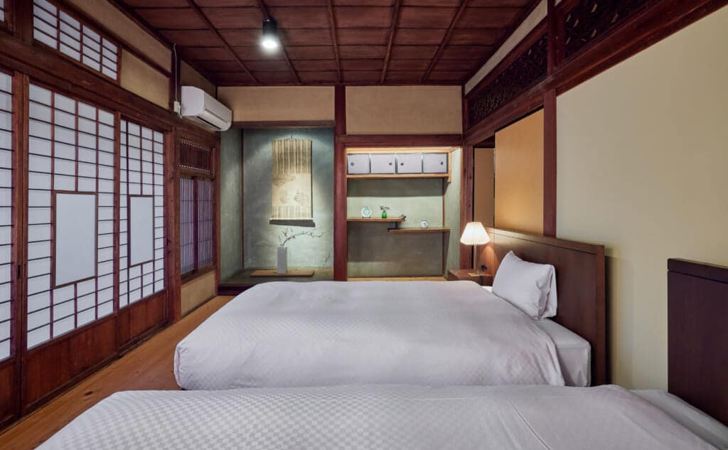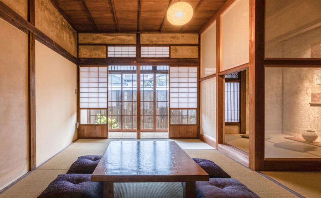 古民家や町家の梁、土壁、建具などの素材感を残しつつ、水回りやベッドなど現代的機能を取り入れています。