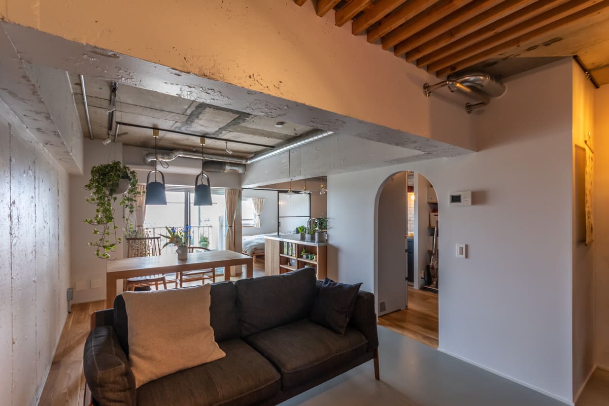 キッチンカウンターにはスツールを置き、カフェのような雰囲気で食事やお酒が楽しめます。コンクリート打ちっ放しの天井と木の質感が調和し、大人の1人暮らし空間が完成しました。
