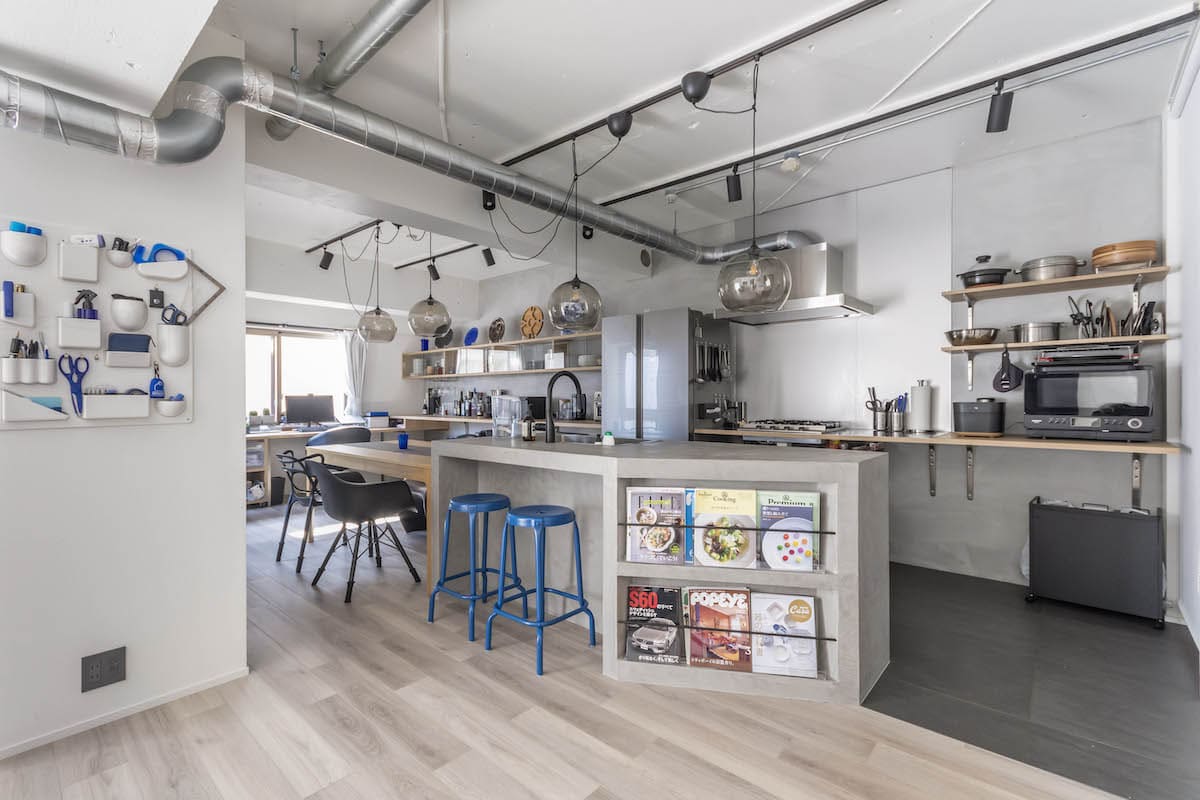自宅で働く夫妻が好きな要素を積み上げて彩った空間。フルオーダーでこだわり抜いたモールテックスのキッチンがあれば、料理の時間も楽しみに。真四角ではない形の物件ならではの「つながり」を意識した動線で、広いお部屋の中でも常にちょうどいい距離感で過ごせます。