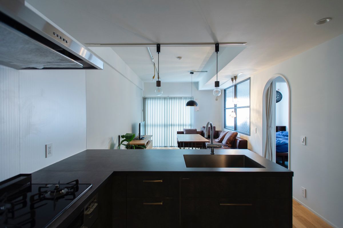 アーチ型の入り口は、玄関やサニタリーとの境界となって、空間に遊び心をプラスしています。L型のレイアウトなので、シンクとコンロの距離が近く、料理の効率も良くなりました。