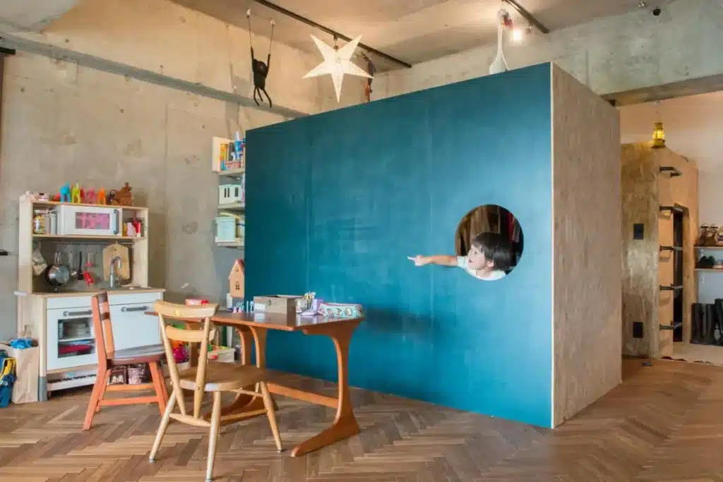 家族が寄り集まって暮らす団地のノスタルジーを求めた施主様に、家全体が回遊動線でどこにいても家族がつながる間取りで応答。家の中心に配置したダイニングと、下部がWICのロフトの寝室のまわりを自由に動き回れます。黒板の壁やロフトに散りばめた小窓など、楽しく遊べる住まい。