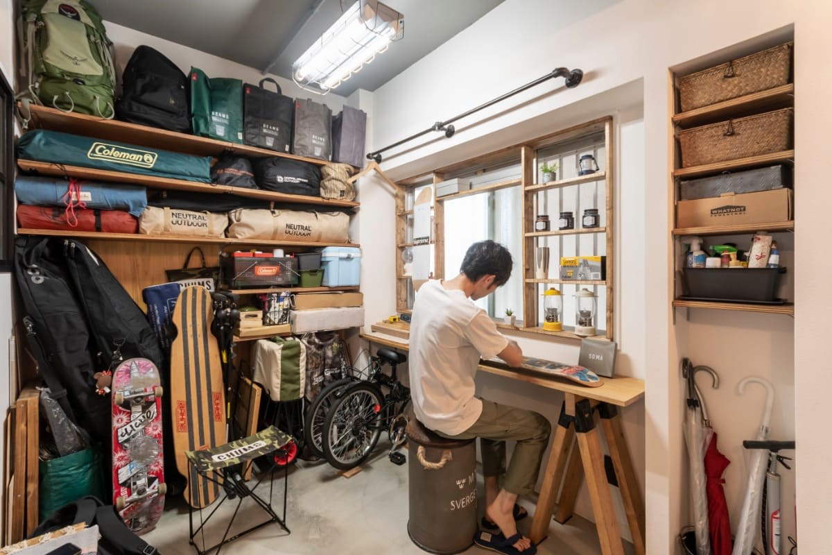 玄関横には、アウトドア好きにはたまらない秘密基地のような土間アトリエ。壁一面の棚に、キャンプ用品やDIYの道具が見せる収納」として並びます。