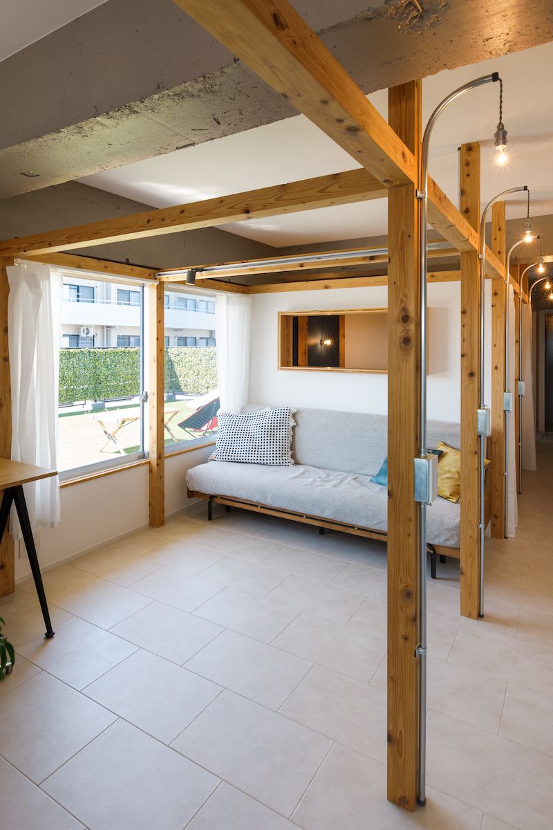 壁を取り払った開放的なワンルーム。壁の代わりにカーテンでゆるやかにゾーニングすることで、1人の時は開放的な大空間として、来客時にはプライベートな空間を隠すなど、暮らしのシーンに合わせて柔軟に使い分けができます。
