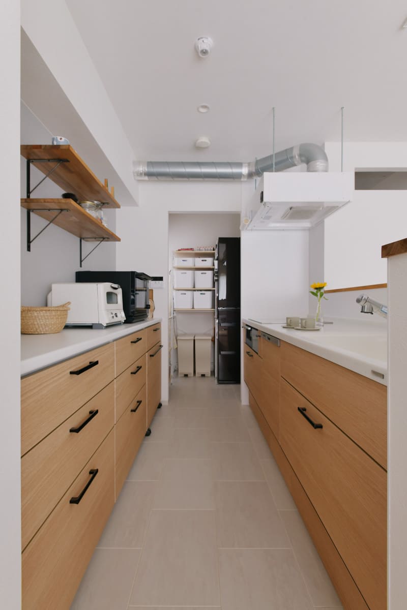 木目と白を基調とした、明るく清潔感のあるキッチン。背面にはたっぷりの引き出し収納と、よく使うものを置けるオープン棚を配置しました。