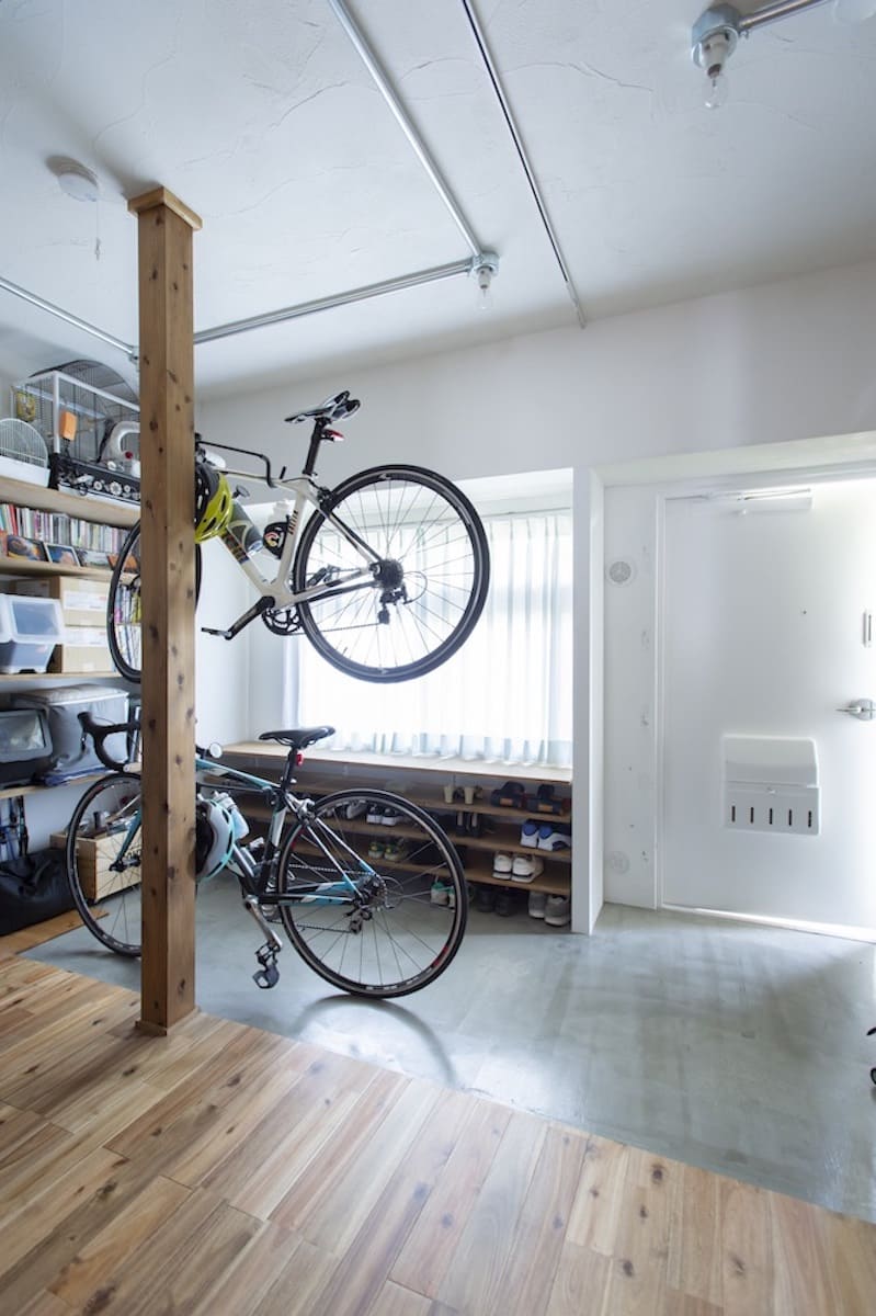玄関ドアを開けると、ロードバイク好きのご主人のために設けた広い土間スペースが広がります。愛車はただ収納するだけでなく、柱を活かして「見せる収納」としてディスプレイ。
