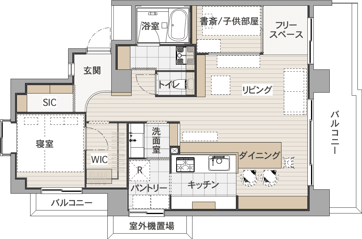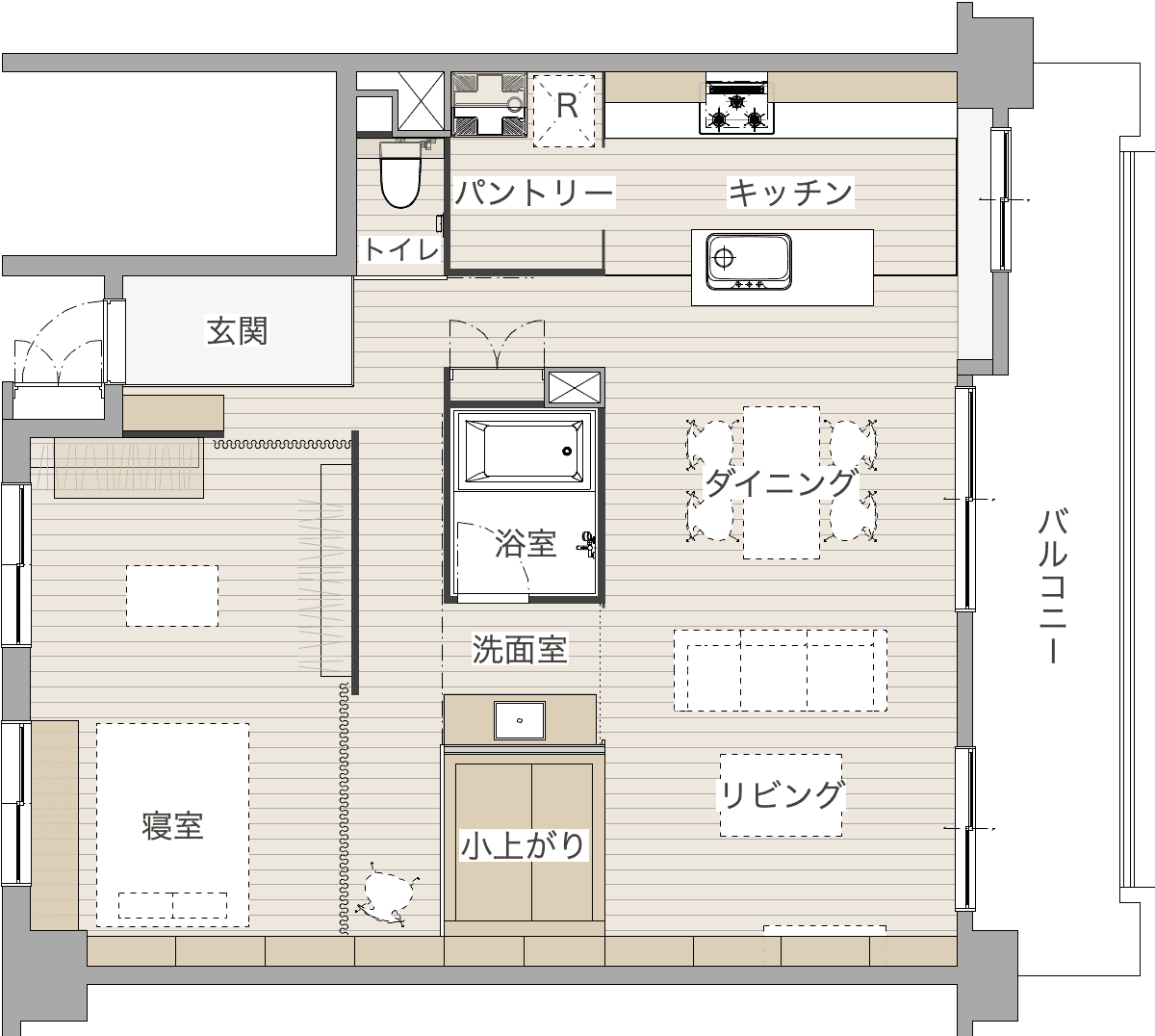 例えば、キッチンや洗面脱衣所、バルコニーが近くにまとまっていれば、料理と洗濯を効率良く進められます。また、帰宅時に玄関からリビングを通らずに洗面所へ行ける動線があれば、外からの汚れを居室に持ち込まずに済みます。
