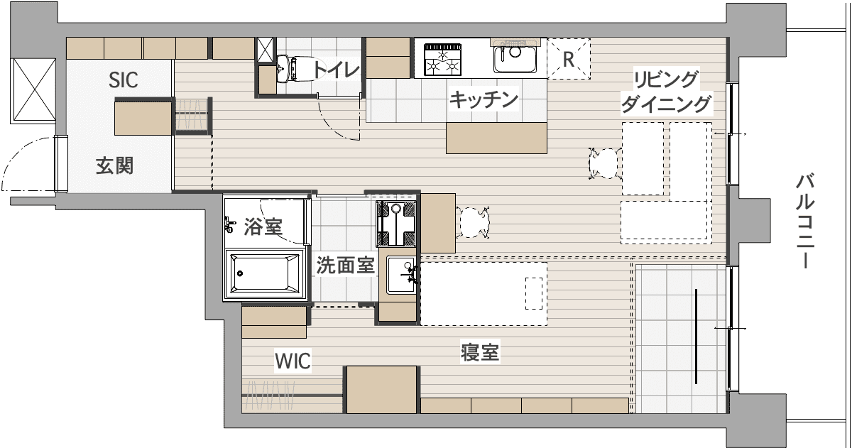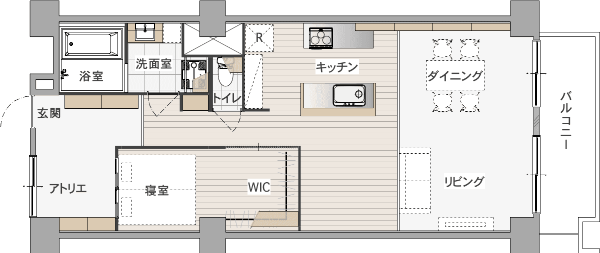 「1K」と「1R」の違いは仕切りの有無にあります。「1K」はキッチンと居室が扉で仕切られているため、料理のにおいが部屋に広がりにくいのが特徴です。一方「1R(ワンルーム)」は仕切りがなく、開放的な部屋に住みたい方に向いています。。