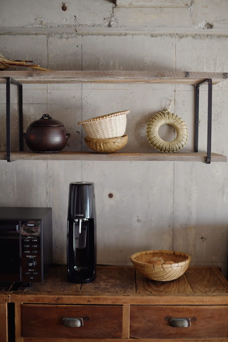 壁には、食器や調理器具を「見せる収納」として楽しめるオープン棚を設置。あえて収納を最小限にして、ものを増やさないすっきりとした暮らしを実現しました。