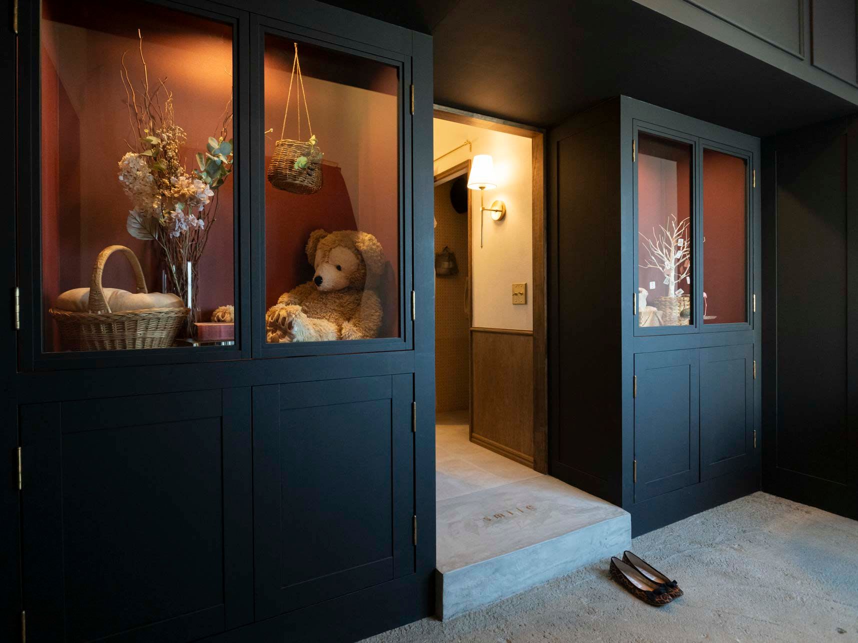 「不思議の国のアリス」の世界観に、少しダークなエッセンスを加えたこの部屋の象徴が、玄関に設けられたお店のファサードのようなショーウィンドウです。