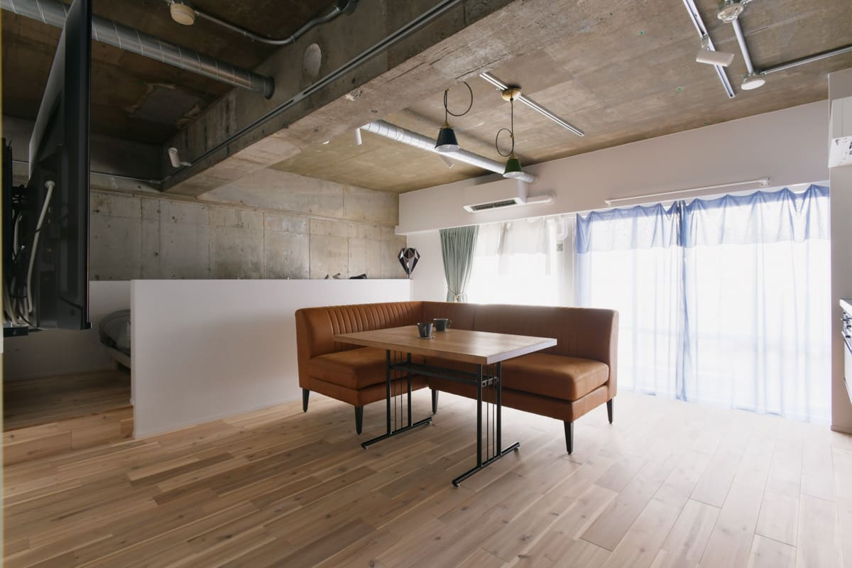 天井はコンクリート打ちっぱなしをそのまま見せ、配管をデザインの一部としています。無骨さと木のフローリングが生む温もりのコントラストが、洗練された印象を与えるリノベーションです。