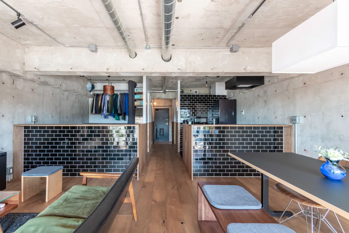 あえて壁を設けず、光沢のあるタイルを貼った腰壁を使い空間をゆるやかに仕切りました。生活感が出やすいキッチンやクローゼットスペースを隠しつつ、視線は奥まで抜けるので、46㎡というコンパクトな空間でも開放的な印象になっています。