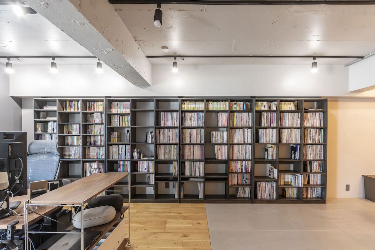 一面の造作本棚に囲まれた大人モダンで開放的な空間【1R/67.86㎡】