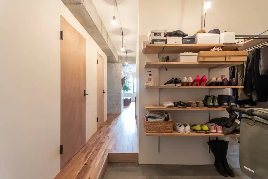 実際にリノベーションする人の中でも人気の高い工事が玄関を広げて土間にするという工事です。マンションの玄関は狭いものが多いですが、リノベーションで広げることで開放感が生まれ、収納なども増やすことができます。
