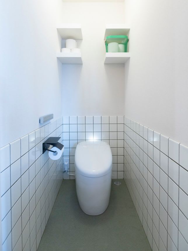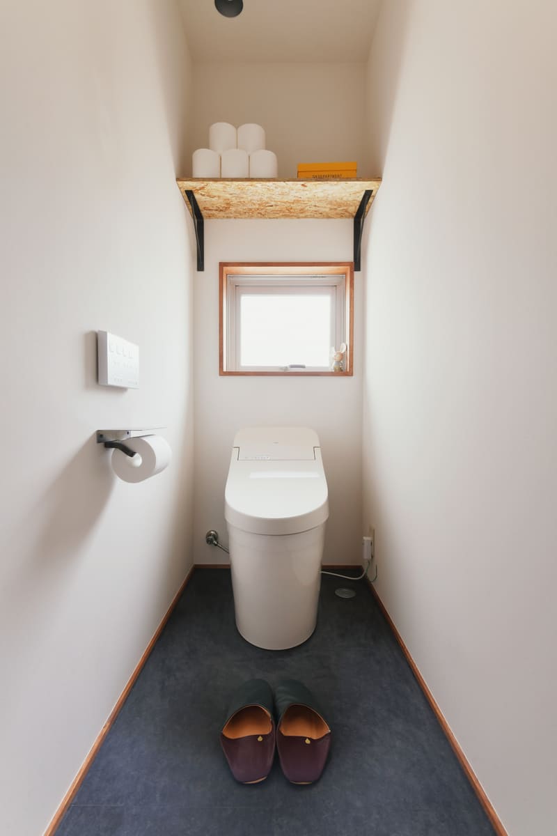 タンクありの便座からペーパーホルダー、棚に至るまで、手間やコストは極力省きながらシンプルにまとめた結果、落ち着ける空間となりました。