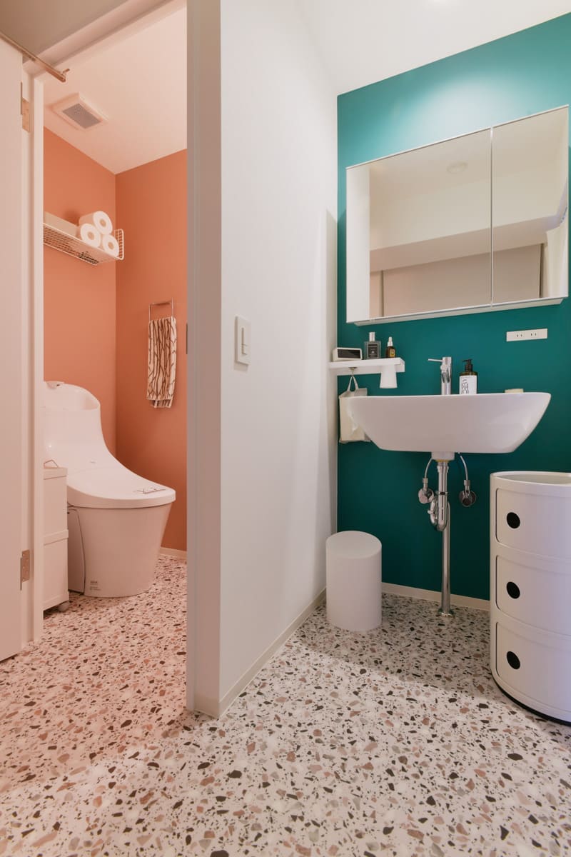 トイレは強めのアクセントとなるこだわりの壁紙と、壁紙に色を合わせた壁面がイキイキとした印象を与えてくれます。